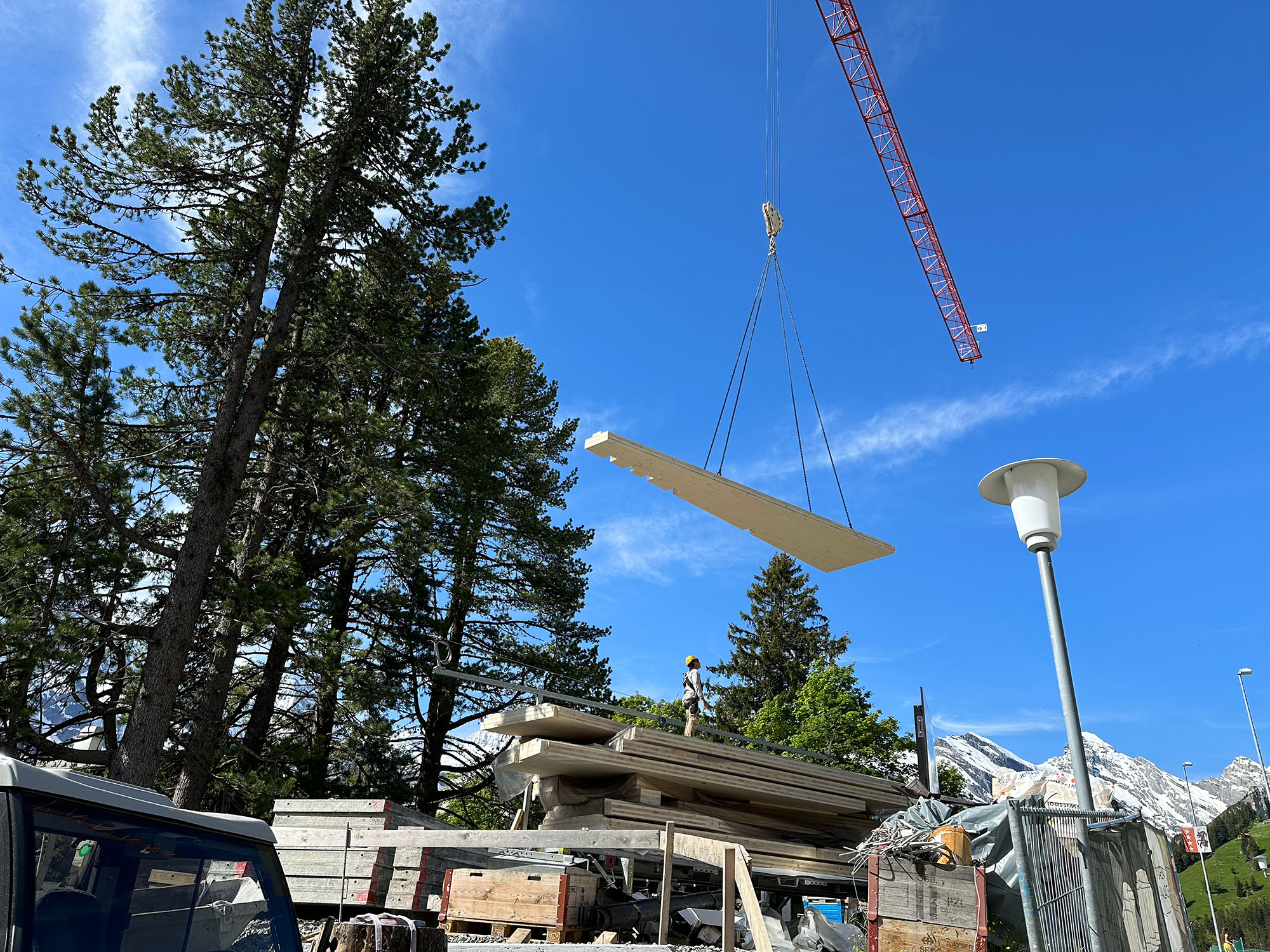 Das Architekturbüro Ducksch Anliker AG realisierte gemeinsam mit Wenger Holzbau AG ein Bauwerk, das modernes alpines Wohnen mit technischer Präzision verbindet. Die Balteschwiler AG übernahm den Abbund der CLT- und Kerto-Elemente (über 1’500 m²), die Fermacell-Beplankung sowie die Organisation der just-in-time-Lieferung ins autofreie Mürren – ein logistisches Meisterstück auf 1’650 Metern Höhe. Dank der exakten Vorfertigung konnten die komplexen Rundelemente effizient montiert werden.