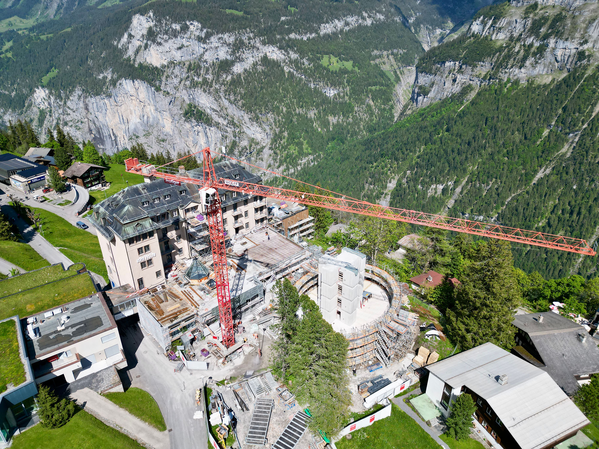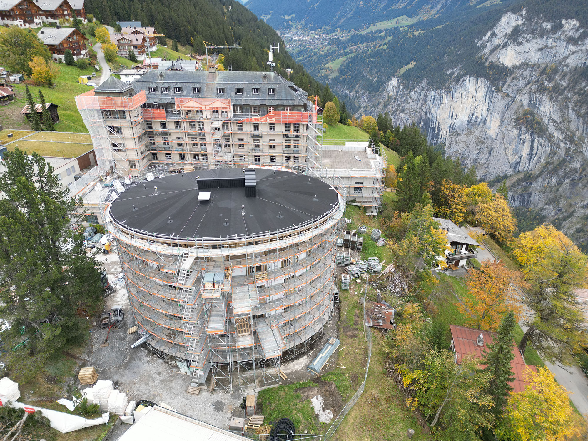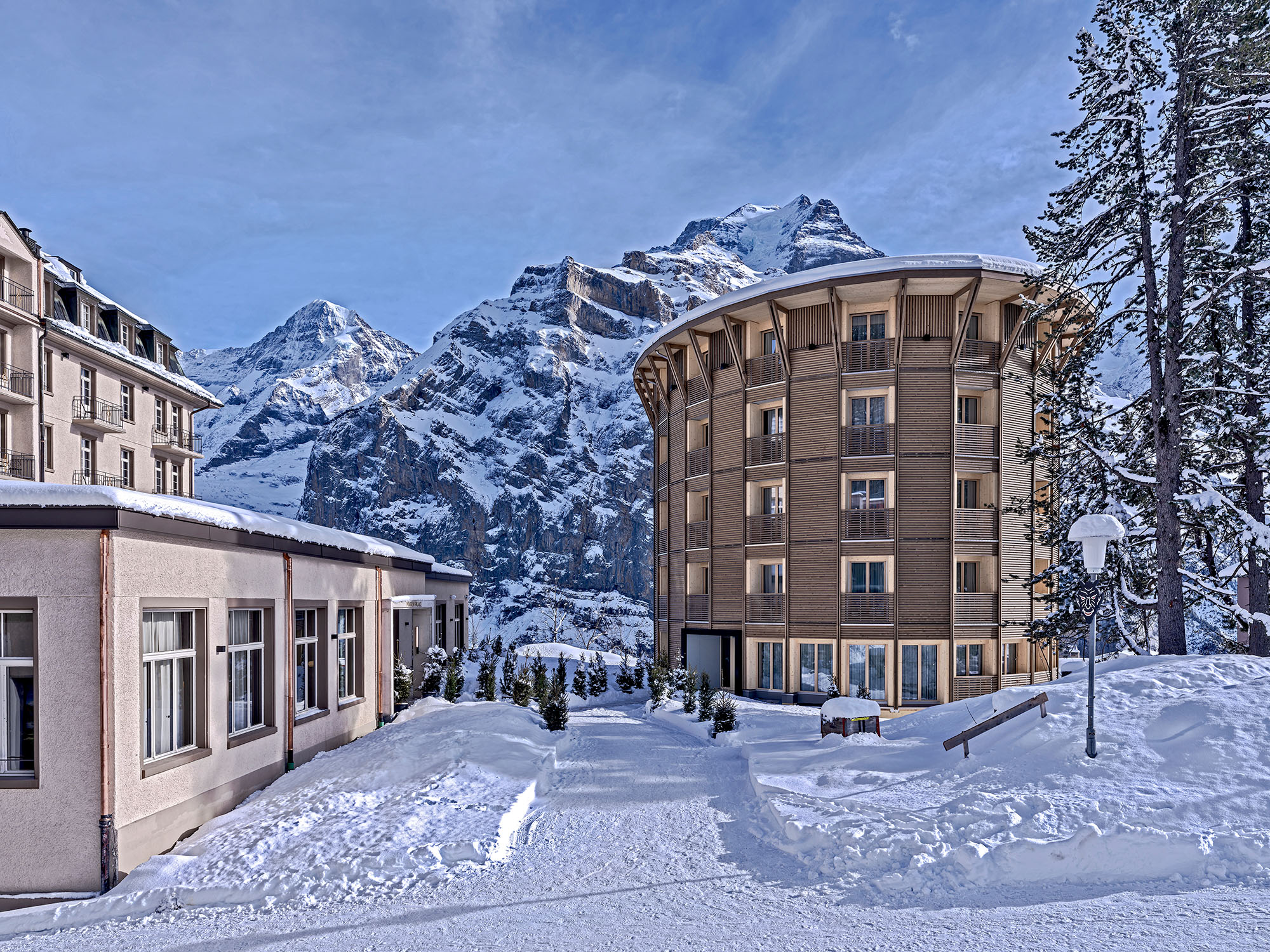 Im autofreien Bergdorf Mürren entstand die neue Dependance des traditionsreichen Hotel Palace – ein fünfstöckiger, elliptischer Holzbau, der das historische Haupthaus perfekt ergänzt.
